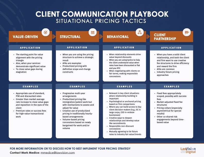 Actionable Insight: Develop an educational program that aligns pricing strategies with individual lawyer performance and firm objectives, reinforced through competency frameworks, practical playbooks, shared case studies, and routine role playing.