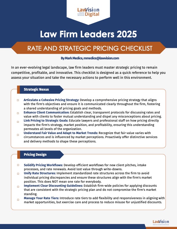 A pricing strategy isn’t about setting rates in isolation. It is about aligning pricing with firm objectives, market dynamics, and client expectations. As highlighted in the ‘Rate and Strategic Pricing Checklist,’ this requires: